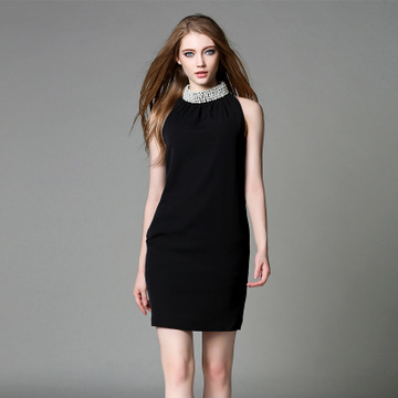 一件代理代發(fā)免費2016歐美時尚女裝無袖連衣裙縐紗釘珠黑色短款 /