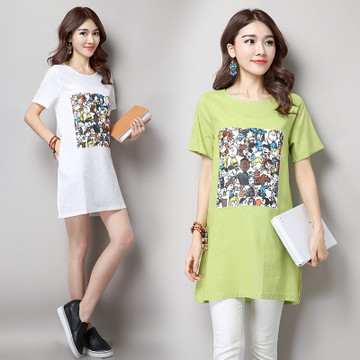 2016夏款新款亞麻連衣裙女文藝小清新卡通人物印花短袖中裙 /