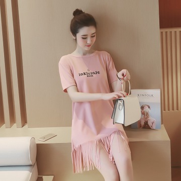 韓國東大門中長款T恤女短袖2016韓版寬松流蘇打底衫 /