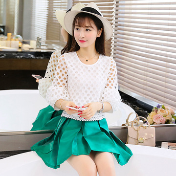2016韓版鏤空蕾絲燈籠袖上衣百褶裙兩件套時尚套裝裙女 /