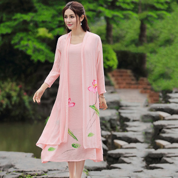 2016夏季新款民族風大碼女裝手繪文藝寬松兩件套兩穿九分袖連衣裙 /