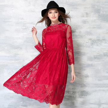 2016夏裝新款 立領鑲鉆長袖中長款蕾絲連衣裙大擺連衣裙女 /