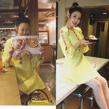 2016年夏裝 微博秀左岸瀟同款連衣裙蝴蝶結裙檸檬黃A字連衣裙 /