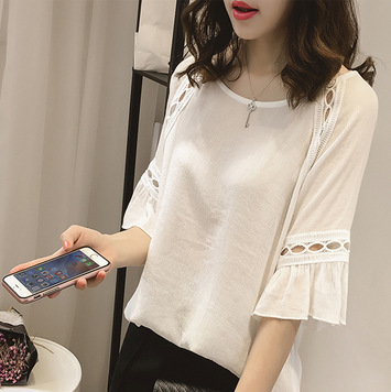 2016夏裝新款雪紡鏤空荷葉邊七分袖上衣寬松顯瘦大碼女裝一件代發(fā) /