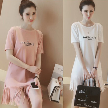 2016新款中長款T恤女短袖夏季韓版寬松流蘇打底衫修身顯瘦T恤裙 /