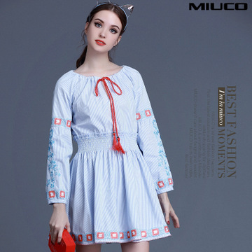 MIUCO2015冬款女裝清新條紋精美民族風(fēng)刺繡流蘇圓領(lǐng)松緊腰連衣裙 /