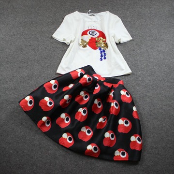 歐洲站鸚鵡套裝2015夏裝新款歐美刺繡亮片短袖上衣蓬蓬短裙兩件套 /