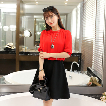 春裝新款女裝打底衫歐洲站修身中袖連衣裙雪紡衫A字套裝裙潮 /