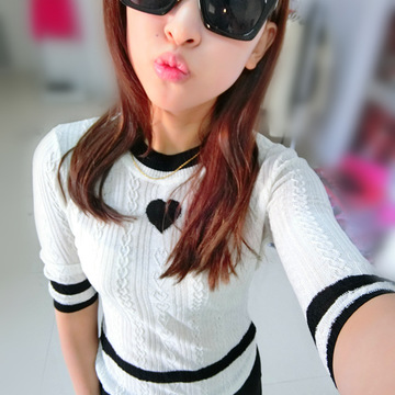 2016春夏新款古力娜扎同款法式甜美優(yōu)雅黑白愛心拼色中袖T恤 /