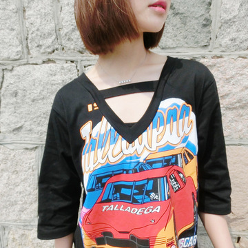 批發(fā) 韓國(guó)新品前后V領(lǐng)設(shè)計(jì) 復(fù)古賽車(chē)卡通印花 五分袖T恤衫 代發(fā) /