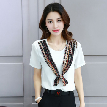 31639短袖襯衫 印花領(lǐng)巾上衣圓領(lǐng)寬松打底小衫新款BESTBAO正女裝 /
