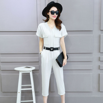 31650條紋休閑褲 V領(lǐng)短袖連衣褲口袋七分連體褲新款BESTBAO正女裝 /