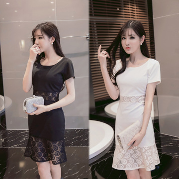 (實(shí)拍)蕾絲拼接性感露腰圓領(lǐng)魚尾擺修身顯瘦連衣裙1643 /