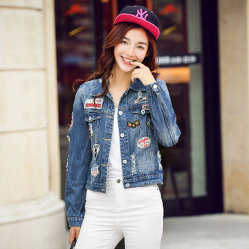 實拍2015新款韓版女裝東大門破洞貼標個性徽章原宿牛仔短外套 /