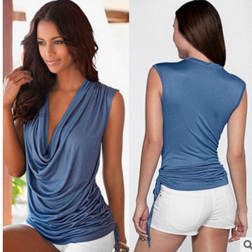 速賣通ebay外貿(mào)熱銷 春夏無袖垂領(lǐng)下擺松緊休閑T恤 /