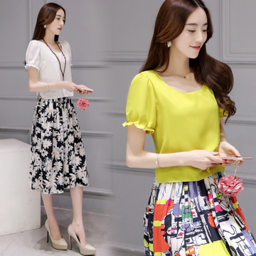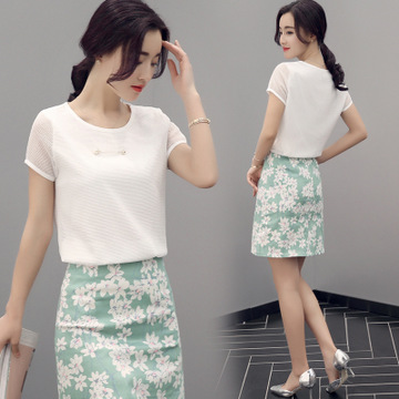 2016夏季套裙配胸針 短袖淑女印花裙套裝女式休閑套裝廠家直銷 /