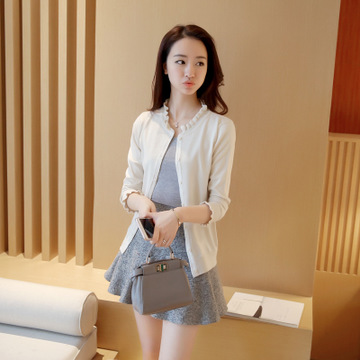 春季新款荷葉邊圓領(lǐng)長(zhǎng)袖單排扣短款針織開(kāi)衫小披肩外套女毛衣批發(fā) /