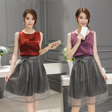 2016甜美韓版夏裝女蝴蝶結無袖字歐根紗網(wǎng)中長款兩件裙子 /
