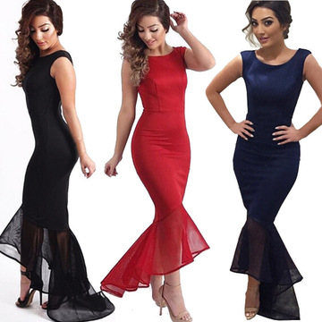 2016夏天新款歐美網(wǎng)紗拼接魚尾圓領(lǐng)連衣裙 /