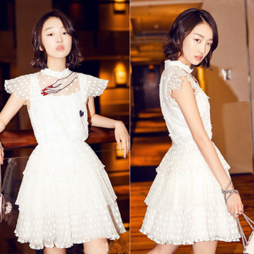 2016夏裝周冬雨微博同款白色圓點短袖蕾絲半身蓬蓬裙連衣裙套裝 /