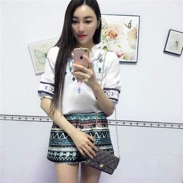 實(shí)拍2016春季民族風(fēng)繡花釘珠白色襯衫+異域波普印花短褲套裝 /