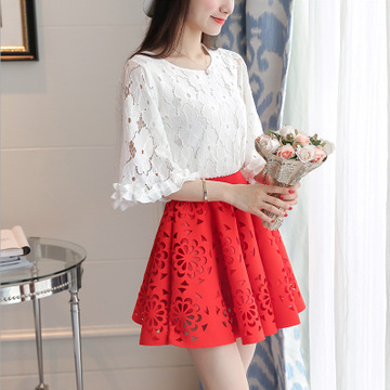 新款夏季女裝甜美顯瘦蕾絲衫鏤空蓬蓬裙兩件套連衣裙套裝裙 /