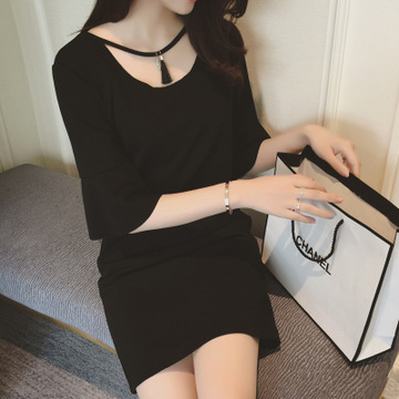 2016大碼新款甜美五分袖寬松純色圓領(lǐng)吊墜荷葉袖胖mm連衣裙 /