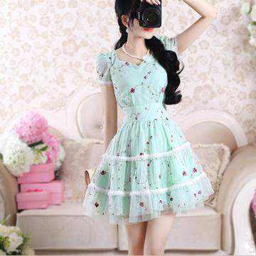 2016夏季新款女裝綠色玫瑰繡花網(wǎng)紗修身顯瘦甜美短袖連衣裙 /