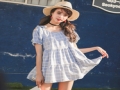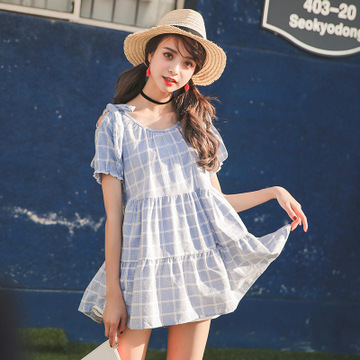 2016春夏新款甜美小清新格子寬松娃娃衫荷葉邊露肩連衣裙女 /