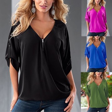 2016速賣通爆款亞馬遜 ebay新款寬松大碼休閑V領(lǐng)拉鏈中袖襯衣 /