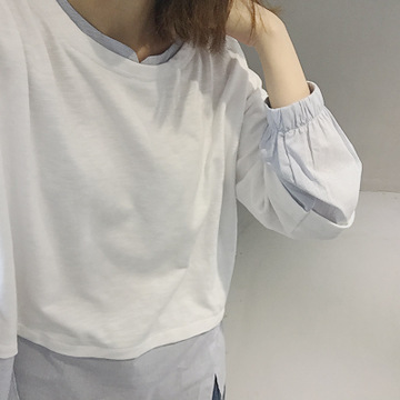 2016韓版拼接牙簽紋細(xì)條紋襯衫下擺袖子假兩件竹節(jié)棉T恤女 /