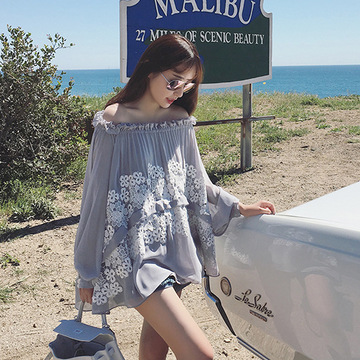 CARIEDO 獨(dú)家設(shè)計(jì)定制 優(yōu)雅灰拼接奶油蕾絲一字領(lǐng)露肩上衣 /