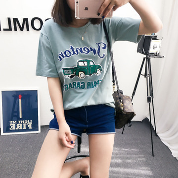 2016夏季新款韓版女裝女式印花小汽車T恤短袖純棉打底衫一件代發(fā) /