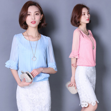 雪紡衫女夏2016新款韓版純色雪紡上衣短袖小衫戴項(xiàng)鏈 /