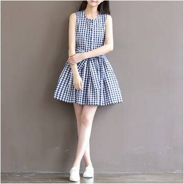 2016夏裝新款大碼女裝文藝小清新格子無袖寬松棉麻連衣裙女 /