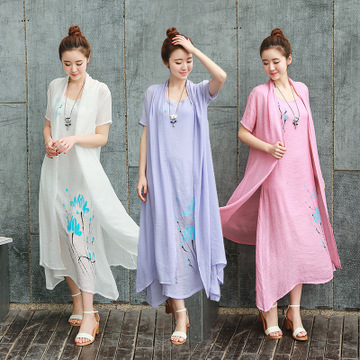 2016女春夏新款棉麻連衣裙短袖套裝裙文藝復(fù)古印花兩件套長裙 /