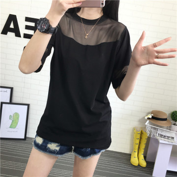 新款拼接紗網(wǎng)T恤寬松大碼純色純棉休閑上衣套頭五分袖簡(jiǎn)約打底衫 /