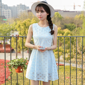 夏季女裝新款韓版時尚印花蕾絲千鳥格無袖連衣裙 女 /