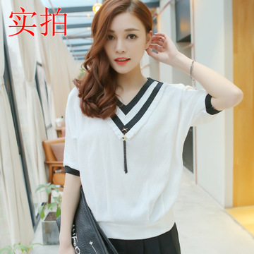 夏季女裝新款韓版 V領(lǐng)拼色雪紡 寬松學(xué)院風(fēng)短袖T恤潮 女 /