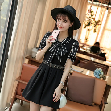夏季女裝韓版時尚條紋拼接短袖收腰假兩件連衣裙女 /