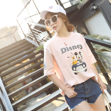夏季新款韓版學(xué)院風(fēng)卡通圖案百搭竹節(jié)棉破洞短袖T恤女 /