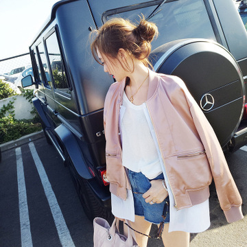 大熱BF風(fēng) 假兩件設(shè)計(jì)粉晶色緞面拼襯衫棒球服貼牌加工 /
