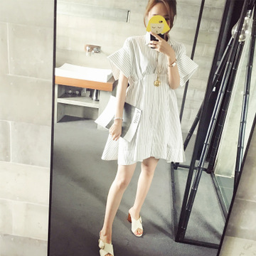 Lin 減齡少女風(fēng) 袖口開叉清新條紋短袖襯衫裙貼牌加工 /
