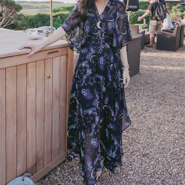 爆款推薦!2016春裝新款星空印花碎花打底雪紡長裙連衣裙女 /