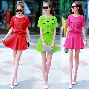 2016新款女裝套裝裙短袖釘珠蝴蝶結(jié)短裙兩件套 套裝女夏 /