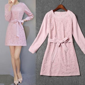 新款韓版女裝 圓領(lǐng)長袖氣質(zhì)顯瘦打底A字裙 蕾絲連衣裙秋 /