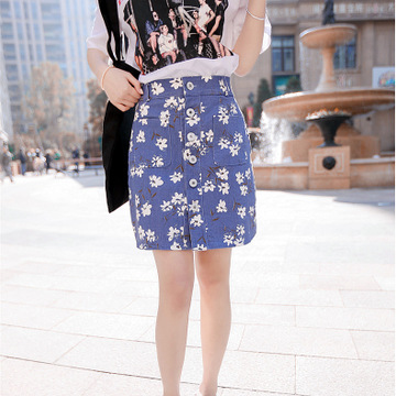 夏季2016新款韓版印花單排扣牛仔短裙a字裙學(xué)院風(fēng)半身裙女8041 /