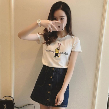 2016韓版新款夏裝印花T恤兩件套單排扣牛仔包臀短裙連衣裙女8044 /