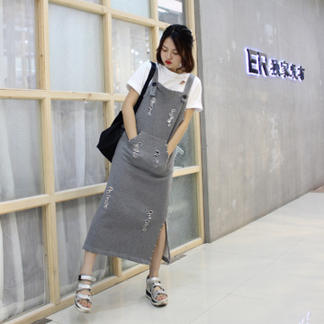 2016春夏新款百搭寬松破洞連衣裙女背帶裙長(zhǎng)裙中長(zhǎng)款大碼胖MM女潮 /
