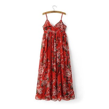 外貿(mào)原單歐美復(fù)古小碎花V領(lǐng)吊帶連衣裙露背雪紡沙灘長(zhǎng)裙吊帶裙女 /